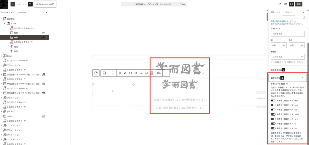 このとき、ロゴ・キャッチフレーズの大きさをPCとモバイルで変えたいなら、同じカバーブロック内に2種類のデータを配置しましょう。その上で、「非表示設定」を使って表示させない画面サイズを指定しておきます(画像参照)。