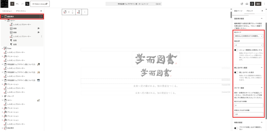 基本的には、VK Blocks Proの「固定表示」ブロックを使い、表示が消えるまでの時間を調整することでローディング画面を作る、という形です。その操作手順は、こちらの魚沼情報サービスさまの記事にも大変分かりやすく記載されています。